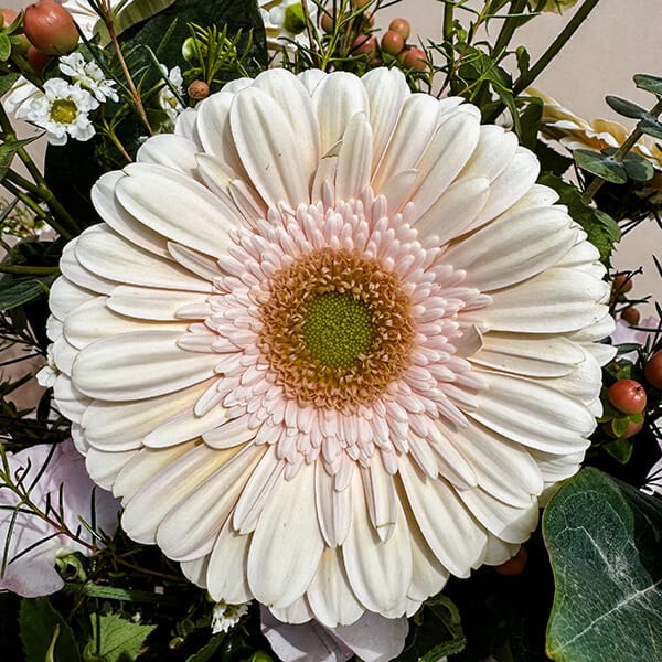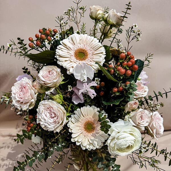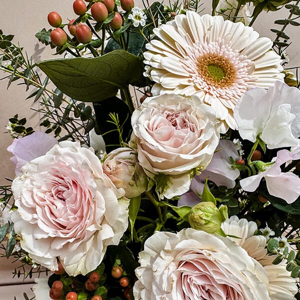 Soft and lovely with gentle colors that evoke bliss. Cream flowers create a warm and cozy look, pastel pink adds a touch of sweetness, and white blooms make everything bright and fresh. The mix of colors makes the bouquet delicate and graceful, perfect for a calm and elegant display.