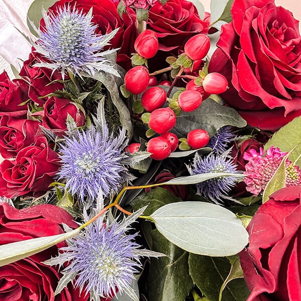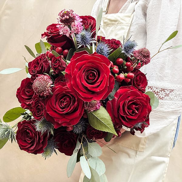 Elegant and striking, with red roses as the focal point. The roses stand out beautifully, creating a bold and romantic feel. Surrounding them, a mix of accent flowers and lush greenery adds depth and balance, making the bouquet look fresh and inviting. This arrangement has a graceful and timeless look, perfect for adding beauty and warmth to any space.