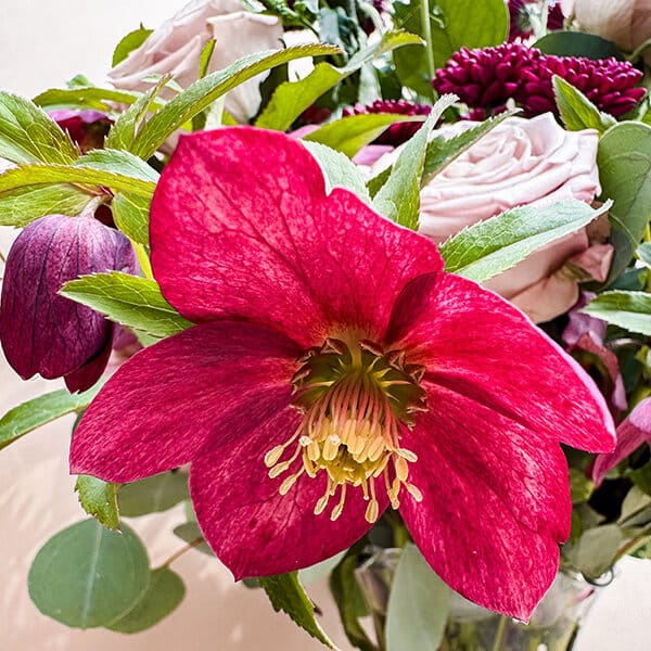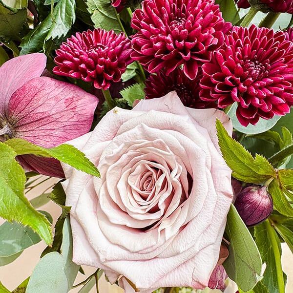 Elegant and charming, featuring burgundy, pink, and white flowers. The deep burgundy blooms add a rich and bold touch, while soft pink flowers bring warmth and sweetness. White blossoms brighten the arrangement, giving it a fresh and graceful look. This arrangement is perfect for adding a stylish and sophisticated feel to any space.