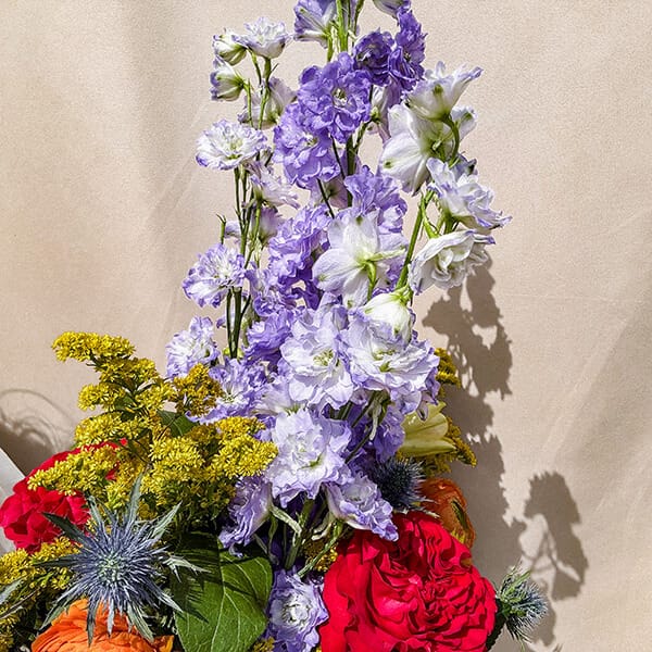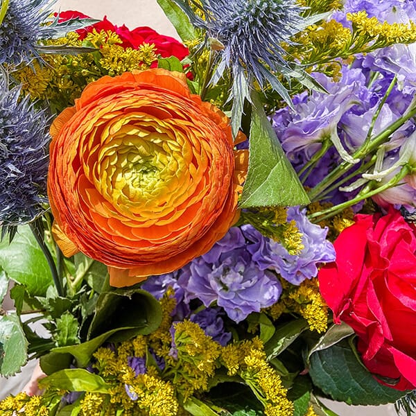 Thoughtfully curated with bright and bold colors, making it fun and exciting to look at. The bright blooms bring energy and happiness, while bright greenery helps balance the colors and make them stand out. Together, the flowers make a beautiful and eye-catching bouquet, perfect for adding cheer to any space.