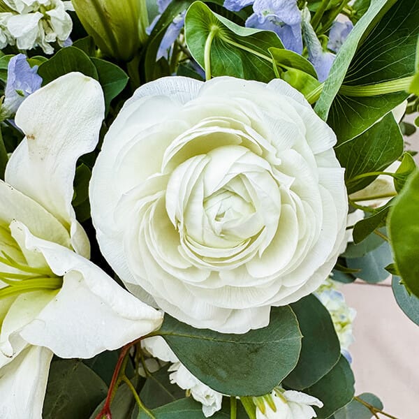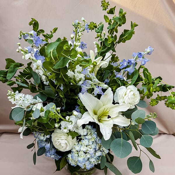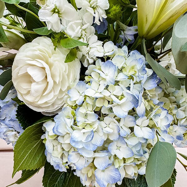 Peaceful and elegant, with a mix of white and blue flowers. The white blooms bring a fresh and bright feel, while the blue flowers add a cool and calming touch. Together, they create a soft and beautiful display. Green leaves help balance the colors, making the bouquet look natural and graceful. This arrangement is perfect for bringing a soothing and stylish touch to any space.